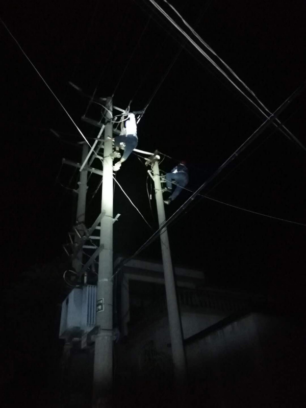 8月5日晚,接到報修電話的值班人員,帶好隨身工具立即到達黃沙一隊查看情況。借著手電發(fā)現一組引線已經燒毀。正值天氣炎熱,為了保證居民正常用電,值班人員一邊安撫居民,一邊聯系值班領導說明情況。值班人員回到所里立即準備搶修材料,值班領導聯系家住在附近的員工前來支援搶修工作。經過近一個半時的奮戰(zhàn),恢復了居民的用電。看見家家戶戶亮起了燈光,渾身濕透的搶修人員才舒了一口氣。( 盧正遷)