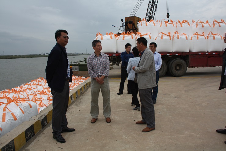 在五灌河碼頭現(xiàn)場,宵洋物流公司工人正忙于裝卸作業(yè),將車輛上化工產(chǎn)品噸袋物資吊裝下船艙,喻振東副局長一行首先到碼頭現(xiàn)場視察碼頭的生產(chǎn)建設(shè)情況,隨后到投資公司三樓會議室進行了座談。