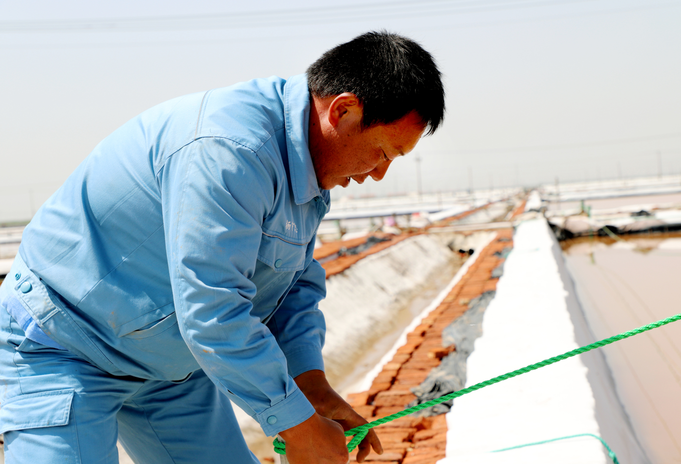 在新河的八班,員工有的在補(bǔ)塑料布,有的在疏通排水溝道,整理繩索,也是忙的熱火朝天。為了抓好二季度工作,八班以生產(chǎn)合格原料食用海鹽為目標(biāo),緊抓有利天時(shí),進(jìn)一步創(chuàng)新海礦鹵勾兌制鹽工藝,細(xì)化工作措施,責(zé)任到人,著力提升原鹽質(zhì)量和產(chǎn)量,目前已生產(chǎn)海水鹽4000噸。