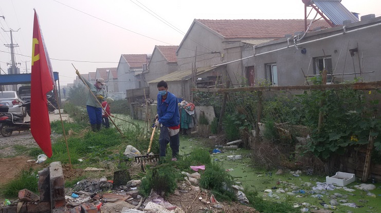 6月20日早6點15分,在中二圩順水道及排水溝兩側已經站滿了或用鐮刀除草或用釘耙打撈漂浮物的人,用力揮舞著手中工具干的熱火朝天。這是埒南制鹽分公司全體黨員和在職員工響應投資公司黨委號召在開展環境整治活動。