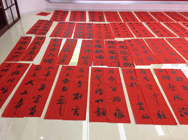 此次活動共邀請了3位書法愛好者為職工免費(fèi)寫春聯(lián)、贈春聯(lián),紅色的春聯(lián)和熱鬧的人群將活動現(xiàn)場映襯得年味十足。書法愛好者們飽含熱情,擺開書案,攤開宣紙,揮毫潑墨,將真誠的祝福賦諸筆端。宵洋物流的職工們紛紛趕來現(xiàn)場排隊幫忙,互相談?wù)撝鞲贝郝?lián)的寓意,有的根據(jù)新年心愿從準(zhǔn)備好的春聯(lián)中精心挑選特邀書寫,有的期望書法愛好者為其精心定制現(xiàn)場創(chuàng)作。濃濃的情意、真摯的祝福溢于字里行間,大家拿著一幅幅寓意喜慶,飽含祝福的春聯(lián),喜笑顏開,不停表達(dá)著對灌云縣海事局和縣書法協(xié)會的感謝。(宵洋物流 邱利民)