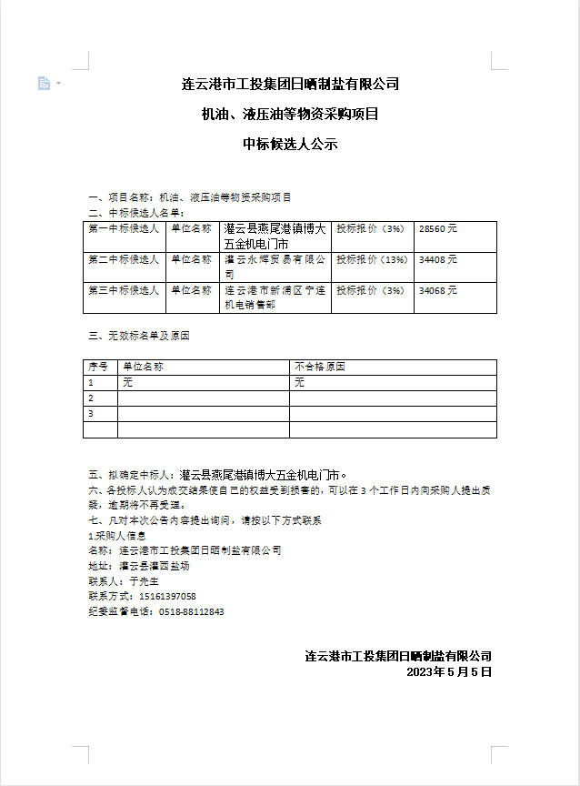 連云港市工投集團日曬制鹽有限公司機油、液壓油等物資采購項目中標候選人公示