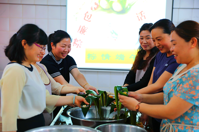 在活動現場,桌子上擺滿了碧青粽葉、黑白糯米、紅豆大棗、白色蓮子,烘托出濃厚的節日氣氛。大家歡聚一堂、歡聲笑語,在傳統文化中感受廉潔元素,一邊聊著家常,一邊包著粽子,先是選好“青”廉衣,然后放入提前泡好的 “蓮”心餡,最后系緊“廉潔繩”,不一會,一個個碧綠飄香、形狀各異“廉心粽”就包好了,被整齊地擺放在竹籃中。紀委書記朱文兵說:“廉心粽蘊含著清正廉潔的美好寓意,組織大家親手包廉粽,是希望大家能夠把‘廉’帶回家,在品嘗美味廉粽的同時,還要時刻繃緊廉潔弦,做到守廉潔、過廉節”。
