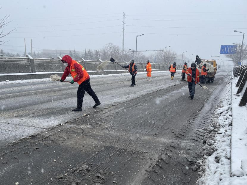 “融雪劑拋灑的時候要均勻拋灑,不要成團堆積,這樣不僅融雪的效果不好,還會浪費物資。”預備黨員武新忠一邊說著,一邊示范著給其他隊員。哪里的積雪最厚,哪里就有他們揮鍬鏟雪的身影。在融雪劑不能及時送達的情況下,他們就使用人工除雪的方式,不斷檔、不離線、不缺位的清除路面積雪,保證路面不出現(xiàn)積雪狀況。為堅決完成上級“雪停路凈”的掃雪除冰任務,他們不畏嚴寒,冒著風雨冰雪,晝夜不停,連續(xù)三天奮戰(zhàn)在掃雪的一線!以雪為令,雪不停,掃雪不止,一直堅守在掃雪工作中,有效清除了區(qū)域內的積雪,確保了交通道路的安全暢行。