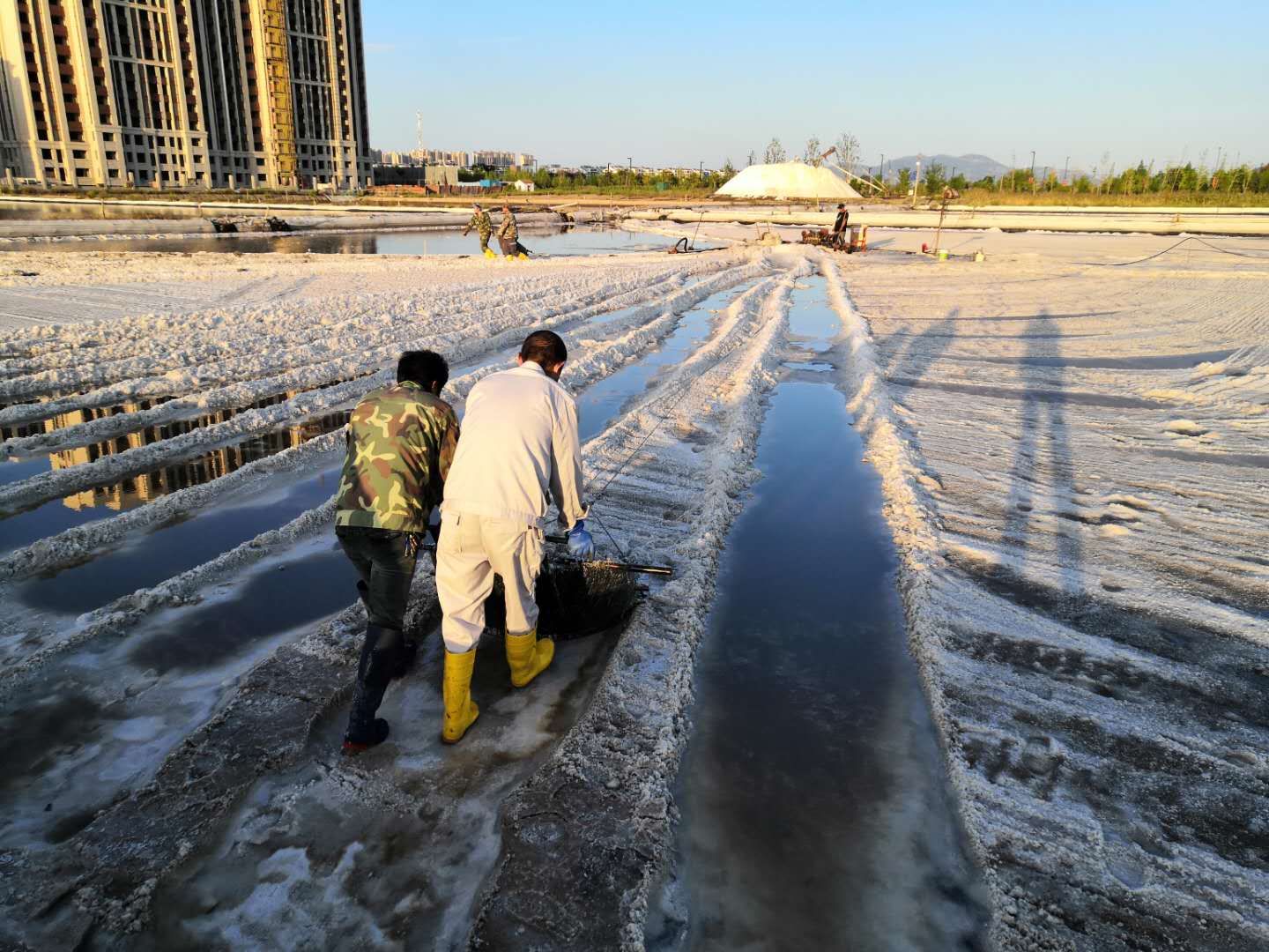 工區加大結晶工藝調整力度,塑苫布及蓋及收,不放過1毫米蒸發量,真正做到“云彩縫里奪鹽斤”。對走完鹽的廩基進行泡制,充分挖掘制鹵潛力,抓好窮制鹵。嚴把結晶灌池關、鹵水進池關、塑池管理關、結晶環境關,搶天時、抓制鹵、促工藝、結合實際加深水工,強制飽和鹵水。針對14、15班已征用灘地,在機械扒鹽后又用人工進行二次扒鹽,將塑池內的鹽斤徹底收回,真正做到顆粒歸倉,為完成原鹽生產計劃盡心、盡力。